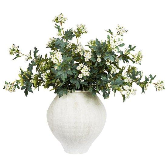 Yeşil tonlarda hazırlanan yaprak ve çiçek dalları gerçekçi bir görünüme sahiptir. Mat ve yumuşak dokulu yapay bitkiler, doğal bir görünüm sergiler. Açık yeşil ve gri tonlarındaki yapraklar, beyaz çiçeklerle güzel bir renk uyumu yakalamaktadır.