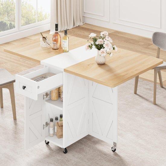 Masa, katlanabilir özelliği sayesinde alan tasarrufu sağlıyor. İhtiyaç durumunda kolayca açılıp genişleyebilen bir yapıya sahip. Üzerinde iki adet depolama rafı bulunuyor, bu sayede mutfak eşyalarınızı düzenli bir şekilde saklayabiliyorsunuz.