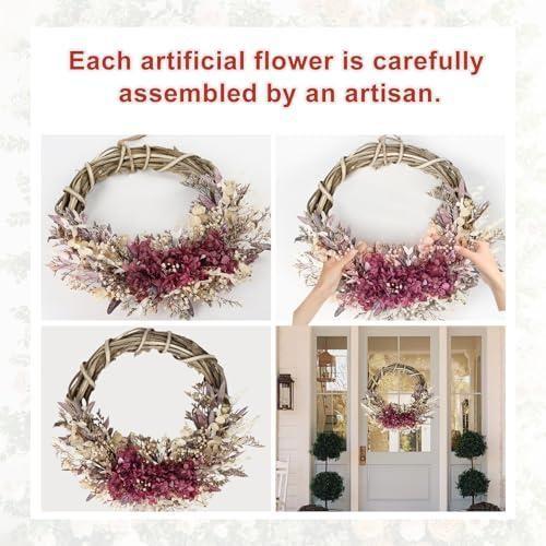 Çelengin temel çerçevesi, dokulu ve gri tonlarda ahşap dallardan örülmüş dairesel bir çerçeveden oluşuyor. Çerçevenin iç kısmı, soluk bej ve canlı pembe tonlarında kurutulmuş çiçeklerle süslenmiş. Özellikle çelengin alt kısmındaki koyu pembe hidrangea çiçekleri, tüm kompozisyona çarpıcı bir renk katıyor.