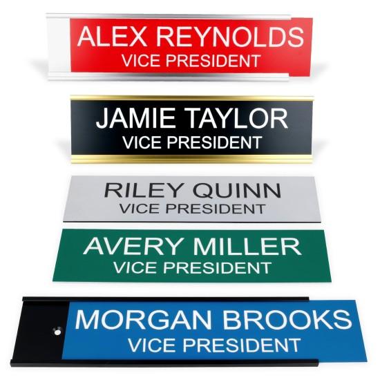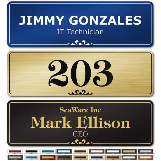 Görsel olarak zengin bir renk yelpazesine sahip olan kapı tabelası; gül altın, gümüş, bronz, siyah, mavi, sarı, yeşil, pembe gibi seçeneklerle geliyor. Her bir tabela üzerinde “YOUR NAME HERE” ve “YOUR POSITION HERE” yazan alanlar bulunuyor. Bu alanlar kişiselleştirmeye olanak sağlayarak, isim ve unvanınızı rahatlıkla ekleyebilmenize imkan veriyor.