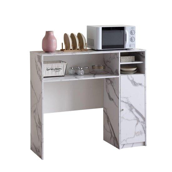 Bu çok fonksiyonlu mutfak dolabı, modern ve pratik tasarımıyla dikkat çekiyor. Beyaz renk ve zarif mermer desen kombinasyonu, mutfaklara şık bir görünüm katıyor.
