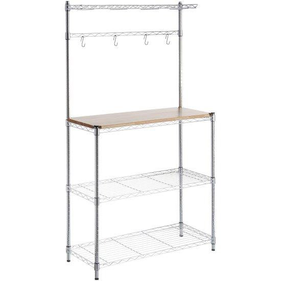 Bu çok katlı mutfak rafı, modern ve pratik bir depolama çözümü sunmaktadır. Parlak krom kaplama metal iskelet üzerine açık ton ahşap çalışma tezgahı yerleştirilmiş. Üç katlı yapısı mutfaklarda alan tasarrufu sağlıyor.