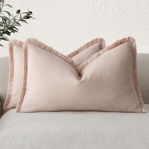 Pudra Pembe Püsküllü Doğal Keten Uzun Yastık Modelleri