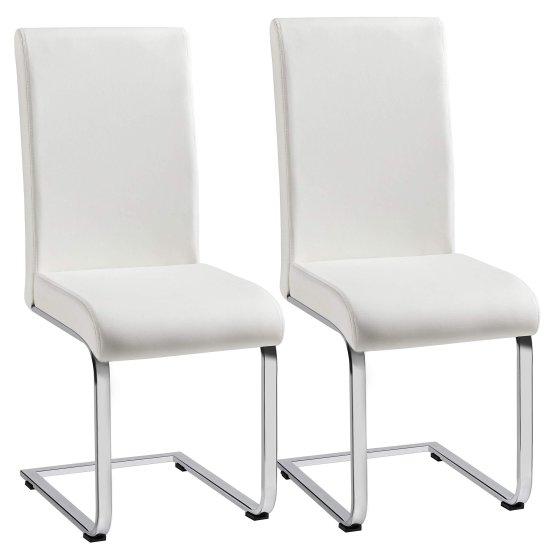 Sandalyeler yüksek kalite suni deri kaplamayla kaplanmıştır. Parlak beyaz yüzeyi pürüzsüz ve temiz bir görünüm sergiler. Paslanmaz çelik krom ayakları, sandalyelere hafif ve modern bir estetik kazandırır.