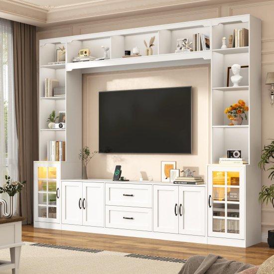 Geniş bir tasarıma sahip olan bu TV ünitesi, toplam 18 farklı rafıyla maksimum depolama alanı sağlıyor. TV’nin her iki yanında bulunan aydınlatmalı bölümler, hem estetik hem de işlevsel bir çözüm sunuyor. Yerleşik ışıklandırma, ünitenin dekoratif özelliğini artırırken aynı zamanda ortama yumuşak bir aydınlatma sağlıyor.