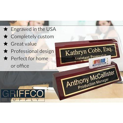 Bu dekoratif aksesuar, profesyonel çalışma alanları için özel olarak tasarlanmış zarif bir masa üstü isimliğidir. Koyu bordo renkli ahşap gövdesi, klasik ve profesyonel bir görünüm sergiler. İsimlik, parlak siyah bir arka plan üzerine altın çerçeveli yazı stiliyle dikkat çekici bir tasarıma sahiptir.