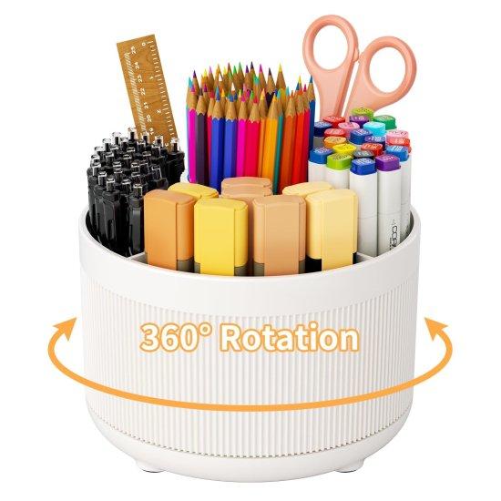 Bu masaüstü kalemlik, çalışma alanınızı düzenli ve pratik hale getiren çok yönlü bir aksesuar. Beyaz rengi ve yumuşak dokulu yüzeyi ile modern çalışma ortamlarına zarafet katar. 360 derece dönebilen özel tasarımı sayesinde her açıdan kolayca erişim sağlar.