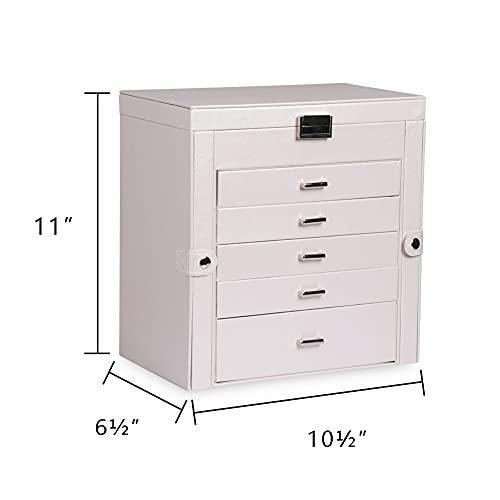 Yaklaşık 25x18x15 cm ölçülerindeki bu takı dolabı, yatak odanızın komodini, makyaj masası veya giyinme dolabı için mükemmel bir aksesuar. Premium PU deri kaplaması dayanıklılık sağlarken, şık görünümünü de korur. Yüzük, küpe, bilezik gibi farklı takı türleri için özel bölmelere sahiptir.