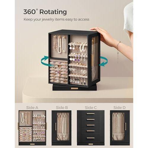 Yumuşak kadife astarla kaplanmış iç yüzeyi, takılarınızın çizilmesini ve zarar görmesini engeller. Sağlam MDF malzemeden üretilen dolap, 360 derece dönebilen özelliği sayesinde takılarınıza kolayca erişmenizi sağlar.