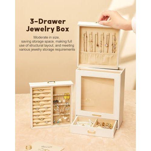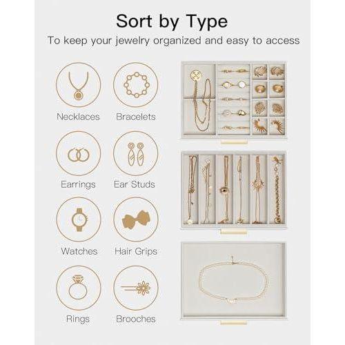 Ürün, üç katlı bir yapıya sahiptir. Üst katında küçük takılar için bölmeler bulunurken, alt iki çekmecesi daha büyük takıları depolamak için idealdir. Şeffaf cam kapağı sayesinde takılarınızı temiz ve toz birikiminden korunmuş şekilde görmenize olanak tanır.