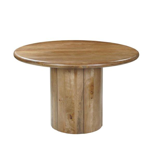 Bu masif ahşap yemek masası, sade ve zarif tasarımıyla modern iç mekanlara şık bir dokunuş katıyor. Yaklaşık 122 cm çapında yuvarlak bir tablaya sahip olan masa, doğal ahşap dokusunu ve sıcak tonlarını mükemmel şekilde yansıtıyor.