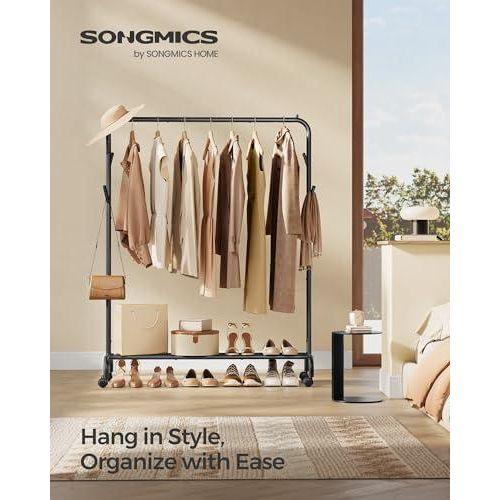 Alt kısımda bulunan raf, ayakkabı veya depolama kutuları için ideal bir alan sağlar. Dört yönlü tekerlekler sayesinde kolayca hareket ettirilebilir. İki tekerlek sabitlenebilir, böylece gerektiğinde askılığın yerinde durması sağlanır.