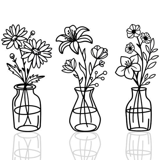 Her bir metal çerçeve, farklı çiçek düzenlemelerini zarif bir şekilde yansıtır. İnce çizgilerle tasarlanmış vazolar, çiçeklerin doğal formlarını yakalayan çizimlerle tamamlanmıştır. Siyah rengi sayesinde modern ve endüstriyel bir görünüm sergiler.