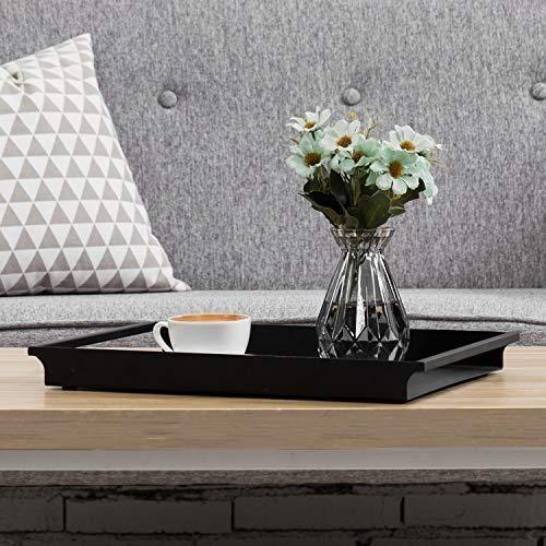 Mat siyah metal kaplaması, tepsiye modern ve zamansız bir görünüm katar. Kenarları düz ve net çizgili olan tepsi, minimalist ve şık bir tasarıma sahiptir. Üzerindeki cam vazo ve kahve fincanı ile mükemmel bir dekoratif düzenleme imkanı sunar.