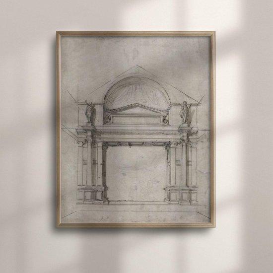 Bu dekoratif duvar posteri, mimarlık sanatının inceliklerini ve detaylarını büyüleyici bir şekilde yansıtan vintage tarzda bir çalışmadır. Açık bej ve tonlarında hazırlanmış resim, tarihi bir binanın mimari eskizini detaylı çizimlerle göstermektedir.