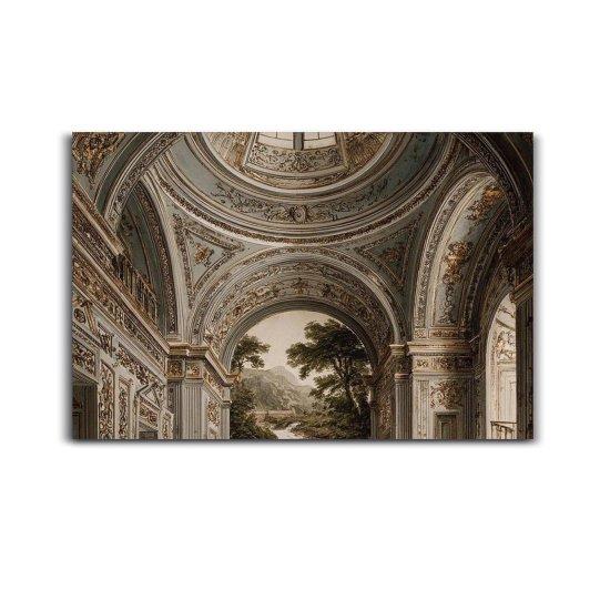 Boyutları 50×75 cm olan bu tuval baskı, vintage tarzda mimari bir çizimi canlandırır. Gri, bej ve toprak tonlarındaki renk paleti, klasik bir estetik sunar. Detaylı kemer yapıları, sütunlar ve mimari unsurlar, izleyiciye tarihi bir yolculuk hissi verir.