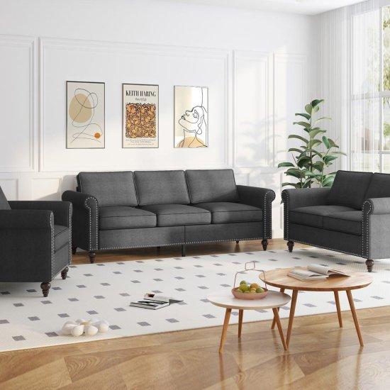 Dar alanlar için ideal tasarlanmış bu kompakt oturma grubu, modern ve fonksiyonel bir çözüm sunuyor. Koyu gri keten kumaştan üretilen kanepe, küçük apartmanlar, ofisler ve oturma odaları için mükemmel bir tercih.