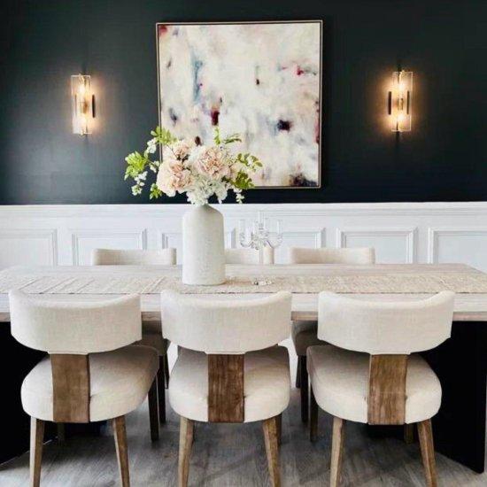 Bu zarif sandalye seti, modern çiftlik evi tarzını mükemmel bir şekilde yansıtan bir tasarıma sahiptir. Ahşap çerçeveli ve bej renkli yumuşak kumaş kaplamalı sandalyeler, hem şık hem de konforlu bir oturma deneyimi sunuyor.