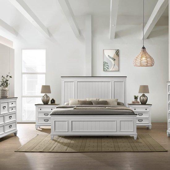 Antik beyaz renk tonu, ahşabın doğal dokusunu ortaya çıkararak klasik ve şık bir görünüm sergiler. Yumuşak gri tonlardaki yatak örtüsü ve yastıkları ile mükemmel bir renk uyumu yakalar.