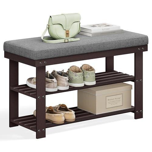 Bu ayakkabılık bankı, günlük yaşamınıza pratiklik ve konfor katan çok yönlü bir mobilya parçasıdır. Koyu kahverengi ahşap çerçevesi üzerinde yumuşak gri bir minder bulunur. İki farklı raflı tasarımıyla hem ayakkabılarınızı düzenli bir şekilde depolayabilir hem de üzerine rahatlıkla oturabilirsiniz.