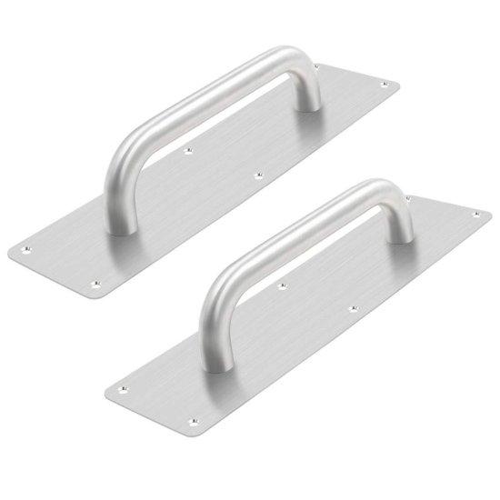Bu paslanmaz çelik kapı kolu seti, profesyonel ve modern bir görünüm sunan dayanıklı bir aksesuar grubudur. Yaklaşık 30 cm x 8 cm boyutlarında iki ayrı plakadan oluşur.