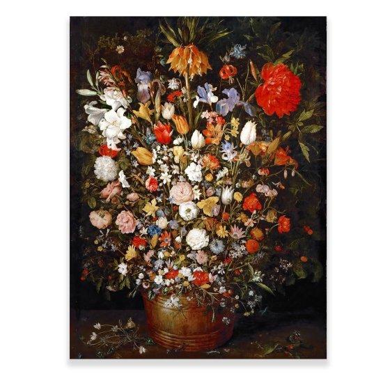 Bu duvar posteri, Rönesans döneminin ünlü ressamı Pieter Bruegel’in çiçek temalı sanat eserini yansıtır. Görsel, zengin ve canlı renklerde çok çeşitli çiçeklerin ahşap bir vazoda düzenlendiği klasik bir natürmort çalışmasını sergiler.