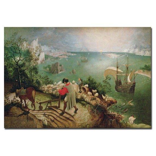 Bu tuval tablo, Rönesans döneminin ünlü Flamanların ressamı Pieter Bruegel’in “İkaros’un Düşüşü” adlı eserinin bir reprodüksiyonudur. Tablo, 16. yüzyılın karakteristik manzara resim anlayışını yansıtan etkileyici bir sanat eseri.