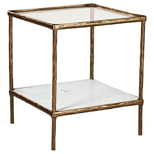 Üst tablası şeffaf cam malzemeden oluşan sehpa, antik pirinç tonunda dökme alüminyum çerçeveye sahiptir. Alt rafında beyaz mermer bulunmaktadır. Yuvarlak hatlardan ziyade köşeli ve net çizgilere sahip tasarımıyla minimal ve zarif bir görünüm sergiler.