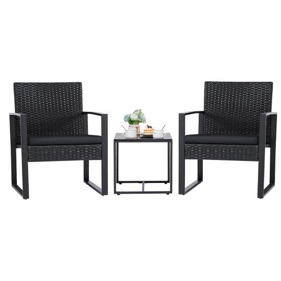 Bu balkon mobilya seti, dış mekan kullanımı için ideal bir çözüm sunuyor. İki adet siyah renkli örme desenli koltuk ve bir adet cam orta sehpadan oluşan set, küçük balkonlar ve teraslar için mükemmel bir seçenek.