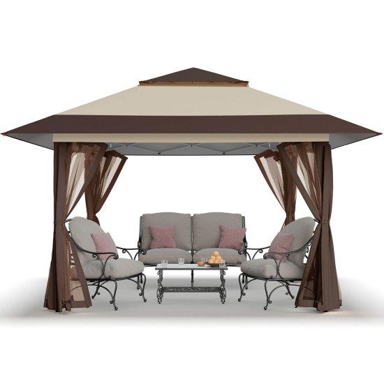 Bu portatif çardak, dış mekan keyfinizi en üst düzeye çıkaracak pratik bir çözüm sunuyor. Yumuşak bej ve zengin kahverengi tonlarıyla, bahçe ve teras mobilyalarınızla mükemmel bir uyum yakalar.
