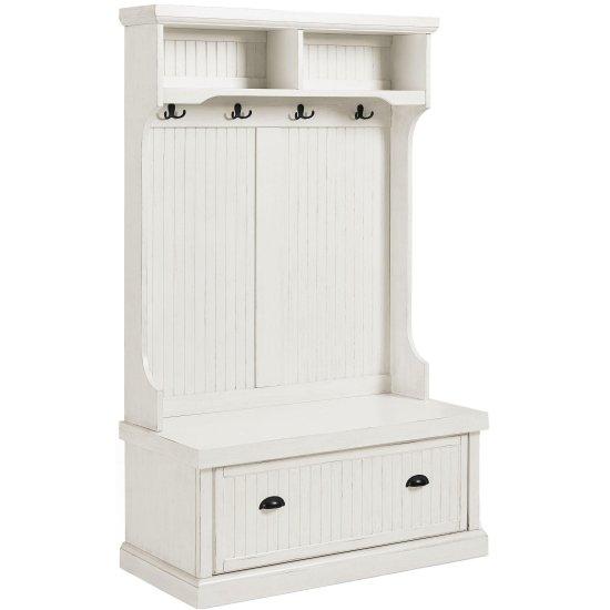 Beyaz yıkanmış ahşap dokusuna sahip mobilya, her türlü ev dekorasyonuna uyum sağlar. Üst bölümdeki açık raflar ve askılıklar sayesinde şapka, anahtarlık gibi küçük eşyalarınızı da düzenli bir şekilde saklayabilirsiniz.