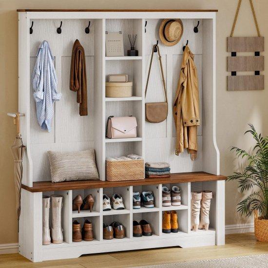 Mobilyanın üst rafları dekoratif aksesuar veya küçük eşyalarınız için ideal alan sağlar. Orta kısımdaki geniş askı kancaları ceketler, montlar ve şallar için kullanışlıdır. Alt kısımdaki bank hem oturma imkanı sunar hem de ayakkabılarınızı düzenli bir şekilde depolayabilirsiniz.