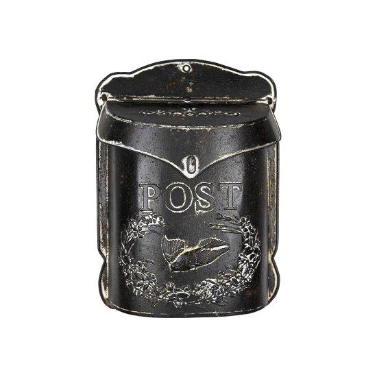 Bu dekoratif posta kutusu, endüstriyel tasarımın şık bir yansıması olarak karşımıza çıkıyor. Tamamen siyah renkli metal malzemeden üretilmiş olup, üzerinde kabartma desenli zarif bir çiçek çelengi ve “POST” yazısı bulunmaktadır.