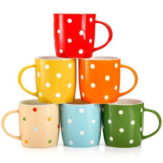 Fincanlar kırmızı, sarı, turuncu, bej, mavi ve yeşil renklerde tasarlanmış. Her fincan üzerinde beyaz puantiye desenleriyle vintage bir görünüm sergiliyor. Fincanların yüzeyi pürüzsüz ve parlak, kullanımı rahat ve ergonomik.