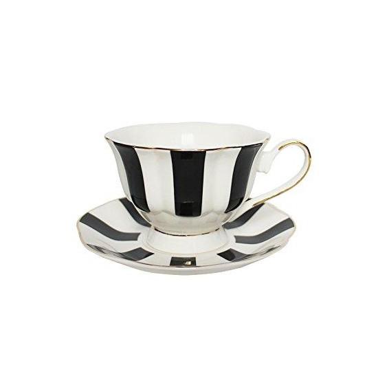 Fincan ve tabağı siyah-beyaz dikey çizgilerle desenlendirilmiş. Zemini tamamen beyaz olan üründe, siyah çizgiler net ve keskin hatlarla işlenmiş. Fincanın kulpu ince, zarif ve altın sarısı tonunda. Bu detay, ürüne aristokratik bir dokunuş katıyor.
