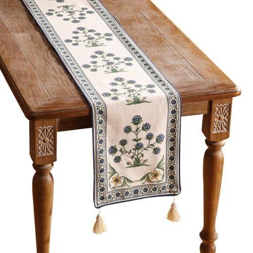 Vintage Çiçekli Bej ve Mavi Masa Örtüsü