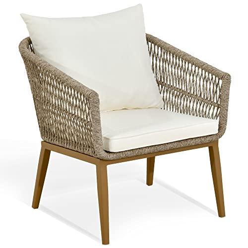 Modern ve şık tasarımıyla öne çıkan bu rattan koltuk, iç ve dış mekan kullanımına mükemmel bir çözüm sunuyor. Doğal görünümlü PE rattan malzemeden üretilen koltuk, bej tonlarında örülmüş dokulu bir yapıya sahip. Ahşap görünümlü ayakları ve yumuşak beyaz yastıklarıyla rahat bir oturma deneyimi sağlıyor.
