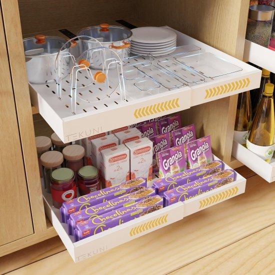 Genişleyebilir yapısı sayesinde farklı dolap genişliklerine kolayca uyum sağlar. İki ayrı raftan oluşan düzenleyici, mutfak malzemelerini, baharatları, konserveleri ve diğer küçük eşyaları düzenli ve kolay erişilebilir şekilde depolamanıza imkan verir.