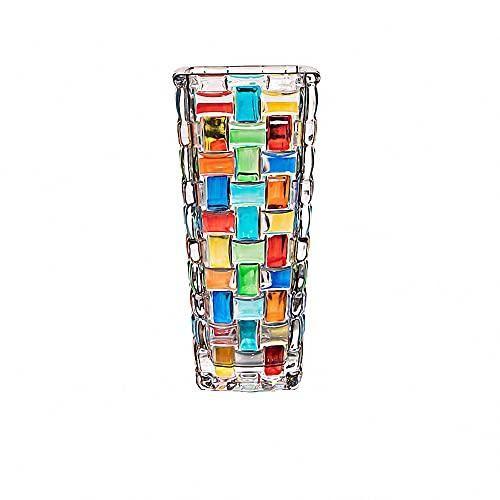 Yaklaşık 20 cm yüksekliğinde ve 9 cm genişliğinde olan vazo, el yapımı özel bir cam tasarım ürünü. Kırmızı, mavi, sarı, turuncu gibi çok renkli cam parçaları, geometrik bir örüntü oluşturacak şekilde dizilmiş. Kristal kalitesinde şeffaf cam alt yapı üzerine renkli cam mozaikler, ışığı çarpıcı bir şekilde yansıtıyor.