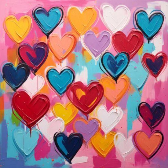 Bu göz alıcı renkli tablo, renklerin ve şekillerin dinamik bir senfonisini sunuyor. Tuvalin merkezinde, canlı turuncu ve sarı tonlarında patlayan bir enerji dalgası görülüyor. Bu merkezi patlama, etrafına mavi, pembe ve mor damlacıklar saçıyor, sanki bir sıvı dans ediyor gibi.