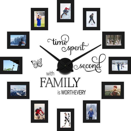 Bu benzersiz duvar saati, zamanı göstermenin yanı sıra sevdiklerinizin fotoğraflarını sergilemenize olanak tanır. 40 cm x 40 cm boyutlarındaki siyah çerçeveli saat, etrafında 12 adet fotoğraf çerçevesi bulundurur. Her bir çerçeve, 5.8 x 5.5 cm veya 8 x 5.8 cm boyutlarında olup, sevdiğiniz anıları korumak için şeffaf plastik bir lensle kaplanmıştır.