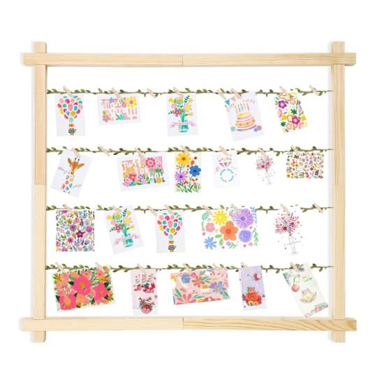 Bu dekoratif ürün, doğal ahşap çerçevesiyle sıcak ve samimi bir atmosfer yaratan benzersiz bir duvar aksesuarıdır. Açık ton ahşap çerçeve, yumuşak ve doğal bir görünüm sergiler. Çerçevenin içinde 30 adet metal klips bulunmaktadır ve bu klipsler çeşitli boyutlardaki fotoğrafları, kartpostalları, tebrik kartlarını ve sanat eserlerini sergilemek için ideal bir alan sağlar.
