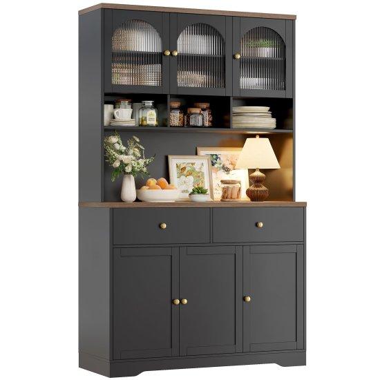 Dolabın üst kısmında cam kapaklı iki bölüm bulunmaktadır. Bu bölümler sayesinde dekoratif mutfak eşyalarınızı sergilerken aynı zamanda toz birikmesini de engeller. Alt kısımda ise iki adet kapaklı dolap alanı mevcuttur. Bu geniş depolama alanları sayesinde mutfak eşyalarınızı düzenli bir şekilde saklayabilirsiniz.