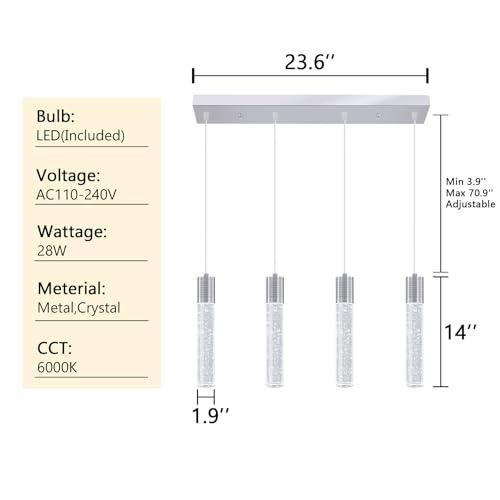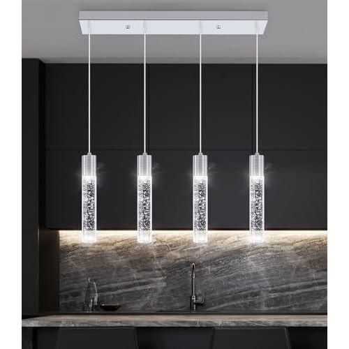 Bu dekoratif aydınlatma ürünü, modern mutfak ve yaşam alanları için ideal bir çözüm sunmaktadır. Dört adet zarif cam gövdeli sarkıt avize, mutfak adasının üzerinde etkileyici bir aydınlatma sağlar. Şeffaf cam gövdelerin içindeki kristal kabarcıklar, ışığın çarpıcı bir şekilde yansımasını sağlayarak dekoratif bir etki yaratır.