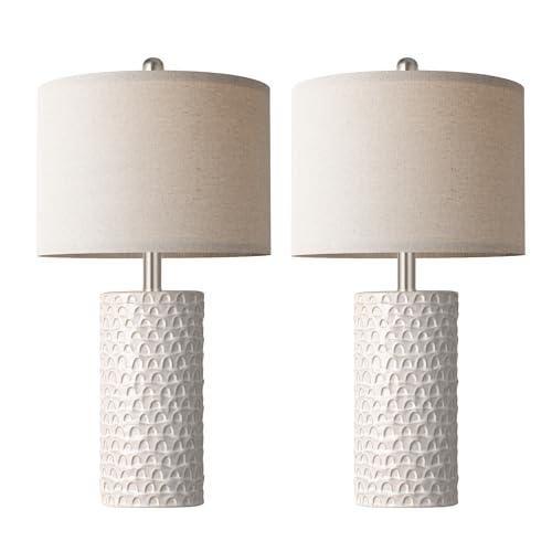 Modern ve zarif çizgilere sahip bu abajur seti, her detayında şık bir tasarımı yansıtır. Beyaz seramik gövdeleri, üç boyutlu dokulu bir desen içerir. Yumuşak krem tonundaki keten başlıkları, ışığı yumuşatarak göze hoş gelen bir aydınlatma sağlar.