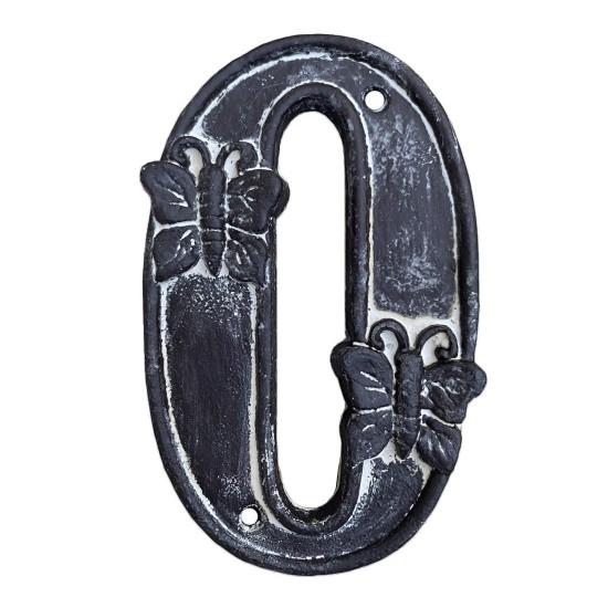 Ürünün yüzeyi antik görünümlü siyah renkte olup, pürüzlü ve detaylı bir dokuya sahip. İki tarafında zarif kelebek desenleri bulunan kapı numarası, rustik ve vintage bir estetik sergiliyor.
