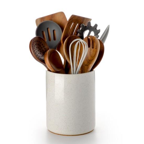 Mutfak çalışma tezgahınıza şıklık ve düzen getiren bu seramik kaşıklık, kullanışlı tasarımıyla dikkat çekiyor. Krem rengi ve mat dokusuyla minimal bir görünüm sergileyen ürün, ahşap mutfak aletlerini zarif bir şekilde bir arada tutuyor.