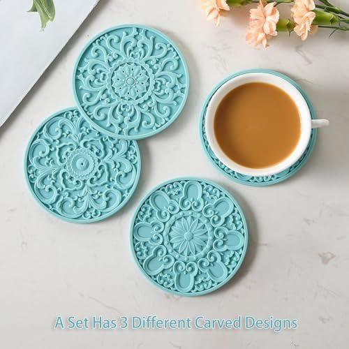 Her bir bardak altlığı, zarif ve karmaşık bir çiçeksel motifle süslenmiş. Oyma desenler sadece estetik görünüm sağlamakla kalmıyor, aynı zamanda bardakların kaymasını önleyen bir tutuculuk özelliği de sunuyor. Silikon malzemeden üretildiği için son derece esnek ve dayanıklı.