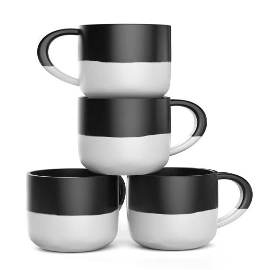 Bu zarif fincan seti, minimalist tasarımı ve çarpıcı siyah-beyaz renk kombinasyonuyla mutfaklarınıza şıklık katacak. Dört adet geniş ağızlı seramik fincan, toplamda yaklaşık 530 ml (18 oz) hacme sahiptir.