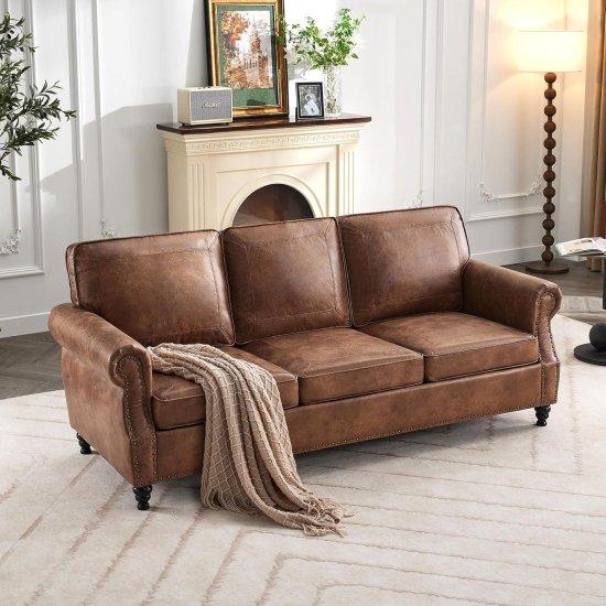 Üç kişilik koltuk, geniş ve rahat bir oturma alanı sunuyor. Yaklaşık 200 cm genişliğinde olan koltuk, ferah bir salon için ideal. Suni deri kaplaması sayesinde temizliği kolay ve dayanıklı bir aksesuar. Metal ayakları ince ve zarif, mobilyaya hafif bir yükseklik kazandırıyor.